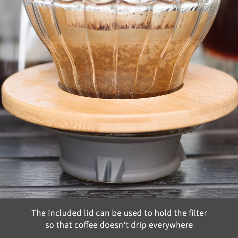The lid has a silicone band to keep your coffee or tea warm and an opening to pour water. The lid also holds your used filter and keeps the table clean.